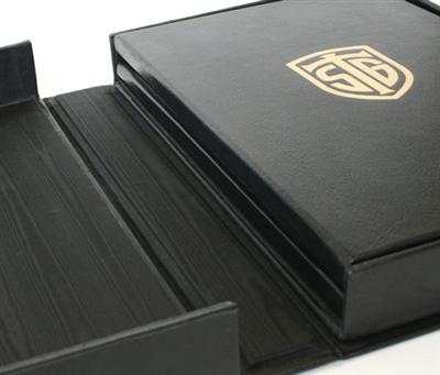 Finest quality imported black bonded leather hard binding with gold gilt lettering and edge-gilding* also. ( *The application of gold leaf to the edges of the leaves of a book which have been trimmed, sized, primed with Armenian bole, covered with gold leaf and burnished.)